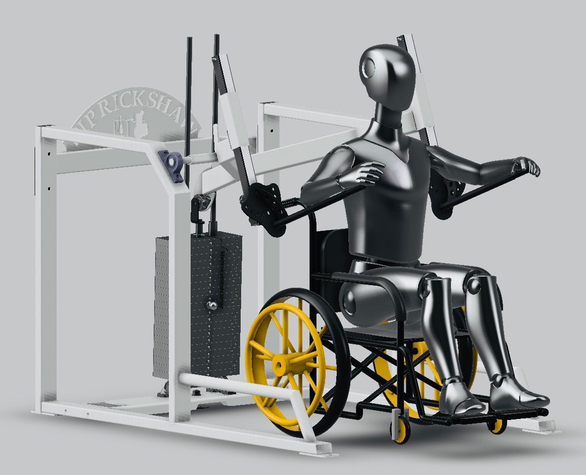 Additionally, this exercise aids in maintaining balance through the back and shoulders, contributing to better posture and alignment of the back, shoulders, neck, and head position. The Dip Rickshaw is designed to accommodate both standard wheelchair and power wheelchair models, ensuring that patients can comfortably operate this user-friendly machine. It can be used effectively at home or in a clinical setting, providing versatility and convenience for rehabilitation programs. Incorporating dips into a rehabilitation routine can help improve upper body strength, enhance muscle coordination, and promote joint stability, contributing to overall functional improvement and quality of life for wheelchair users.